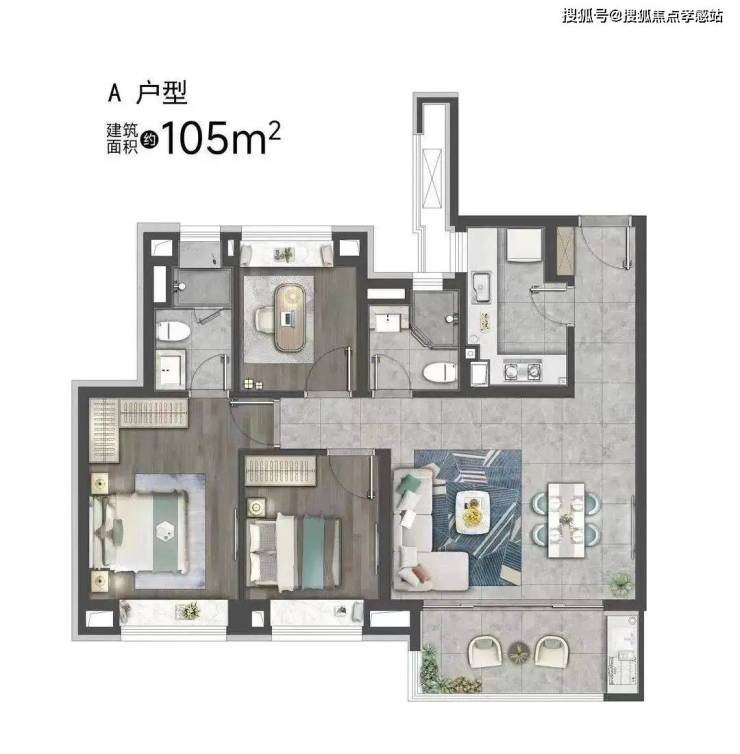 105平三房两厅两卫,在设计中淡化空间的边缘,让客餐厅和阳台一脉相连,居住感又进一步扩大了,最大程度带来阳光,和新鲜空气。约5.1米的宽厅,无论是日常休息还是会客都显得大方得体。