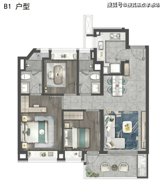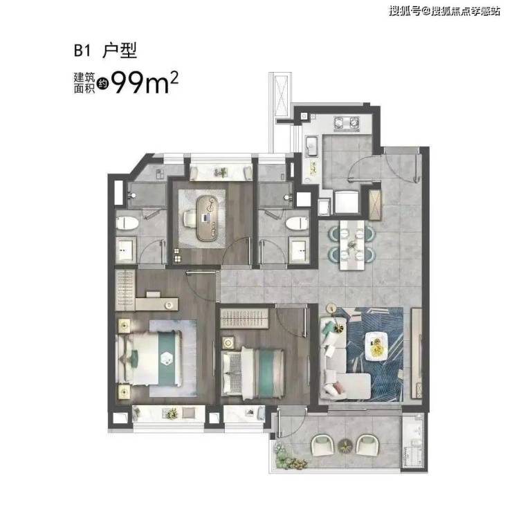 99平的三房两厅两卫,客餐厅连接景观阳台,采光面积更大,为日常生活带来更多的舒适感,并且多了一个卫生间为我们日后带来更为便利的生活。