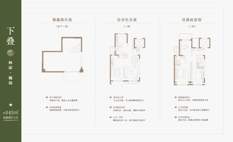 叠墅产品分为4F、6F层叠加, 主力产品建面约约122-133㎡上叠,132㎡大平层,131-145㎡下叠。