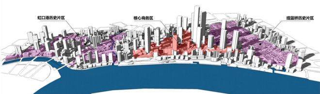 核心商务区主打商务办公的高强度开发;两侧提篮桥、虹口港历史片区依托历史资源走低强度开发的保护和提升品质路线。