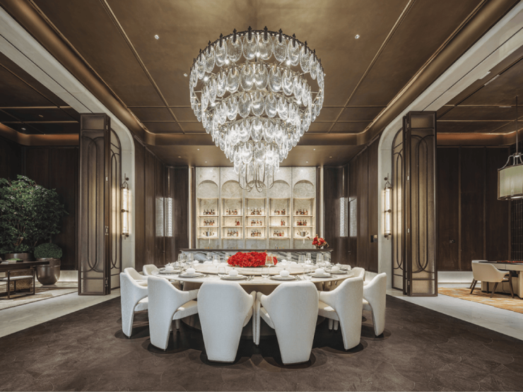 独具格调的「圈层私宴厅」+「女王茶室」,对于偏爱宴宾与私晤圈邻而言,两处栖心聚场境显摩登腔调,无论是整块香格里拉绿奢石壁炉、白水晶奢石酒架、全景开放式落地窗……每一处细节的精研,都在彰显飨宴、雅集的品位。