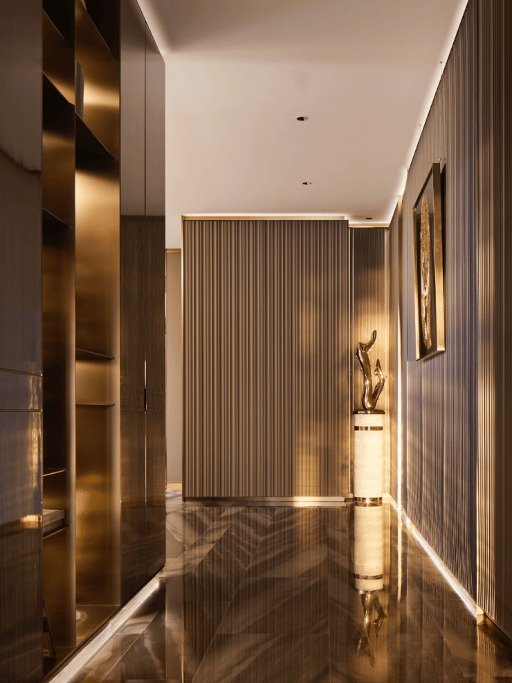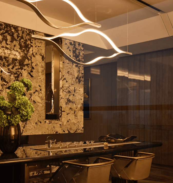 灯具采用葡萄牙奢侈灯饰品牌LUXXU的产品,在黄铜、玻璃和施华洛世奇水晶在手工工艺的结合下,形成了独特的精美光影表现,既是简洁空间的巧妙点缀,也是个人生活品质的彰显。