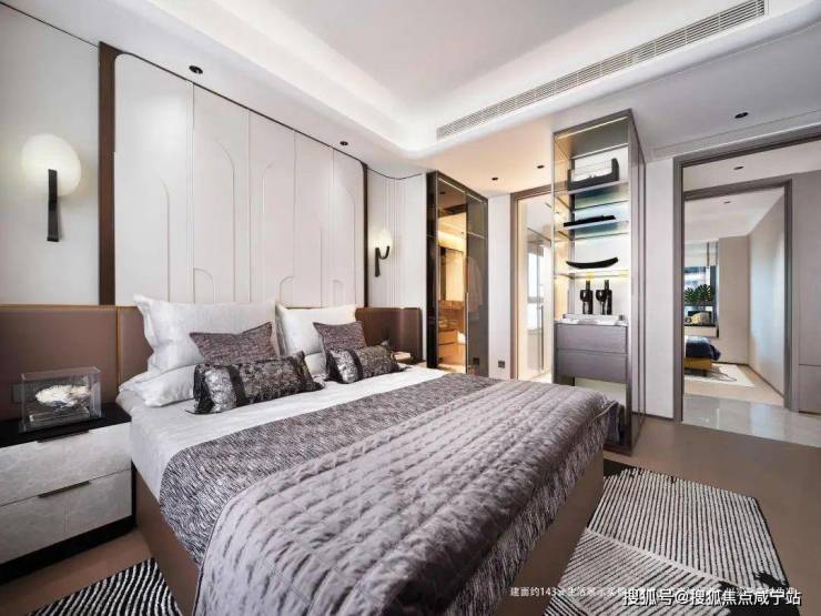 约14米南向开间如同巨幅城市全景画框,270°环幕阳台揽尽一城的昼夜光影流转。U型厨房与客餐厅无缝相连,从容备餐时,也可随时回应客厅间的谈笑。南向双套卧各主一方,筑起隐私屏障;主卧套房预留独立衣帽间位置、明卫系统设计,于私密空间中复刻五星级酒店的尊崇动线。