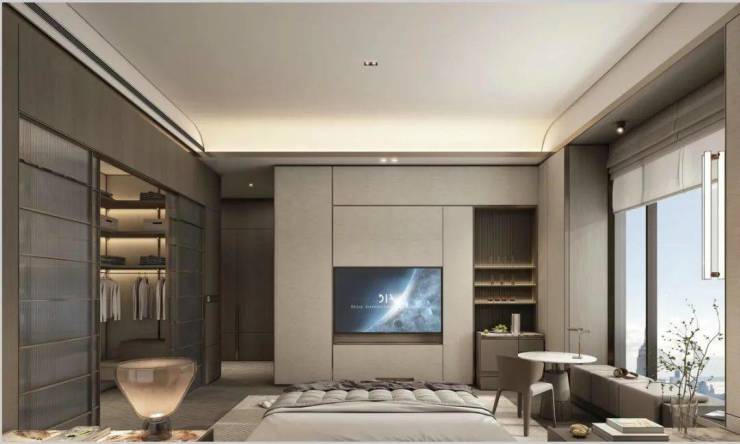主卧的床尾处利用空间的在设计利用多了一个去向主卫的衣帽间,门套整体上顶的设计让房门门套的感觉更加整体耐看,衣帽间作为主卫和主卧的转折空间也赋予了更多的实用性。