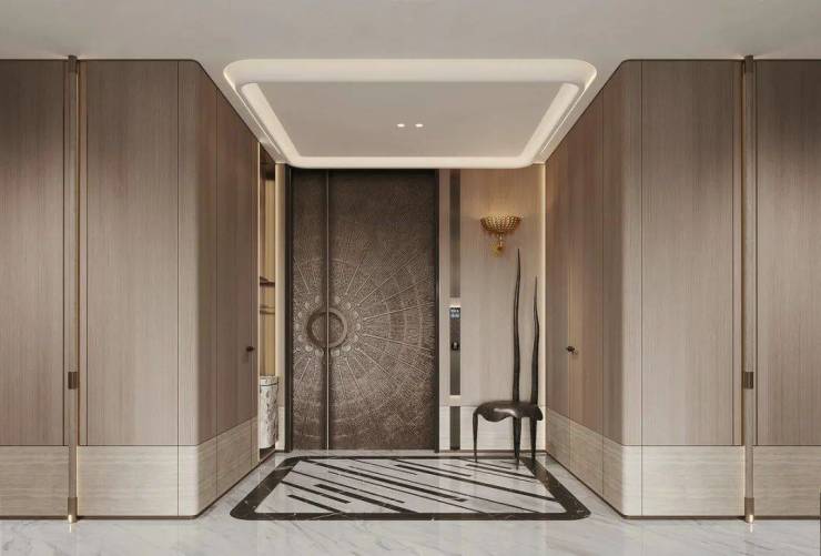 透过鞋柜看向过道,门全部做了到顶的处理,中间的腰线在公共开放区域是整体贯穿的元素,并结合柜门的开启高度,硬包的中线高度等等做了一个整体的联系。