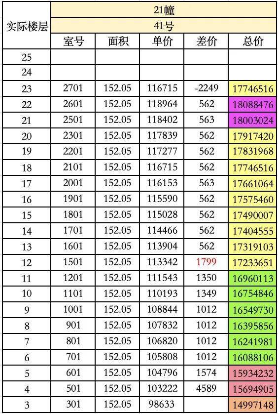 我把每个楼栋单元的均价都列出来了,然后和大家聊一下不同位置各户型的价格逻辑,为什么这么定价。