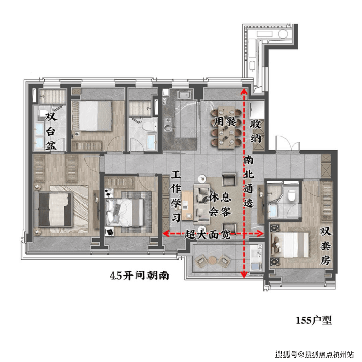 首先一梯一户的设计,给足业主的私密感,独享电梯厅、子母门更享有尊贵感,4.5米的开间朝南大横厅,双明卫设计,采光十足;LDKG大厅南北正向通透,北侧用餐区采光十足,还多做了一组收纳,南向客厅面宽足够大,沙发后面还可再加一组书桌;朝南双套房,给每位业主提供便捷私密的生活体验,主卫双台盆设计,更显豪宅的奢华感。