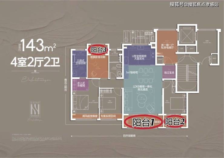 建面约143㎡的四房:户型格局方正,全屋飘窗(5个)+全阳台(3个)+全明电梯厅!赠送面积十分可观!