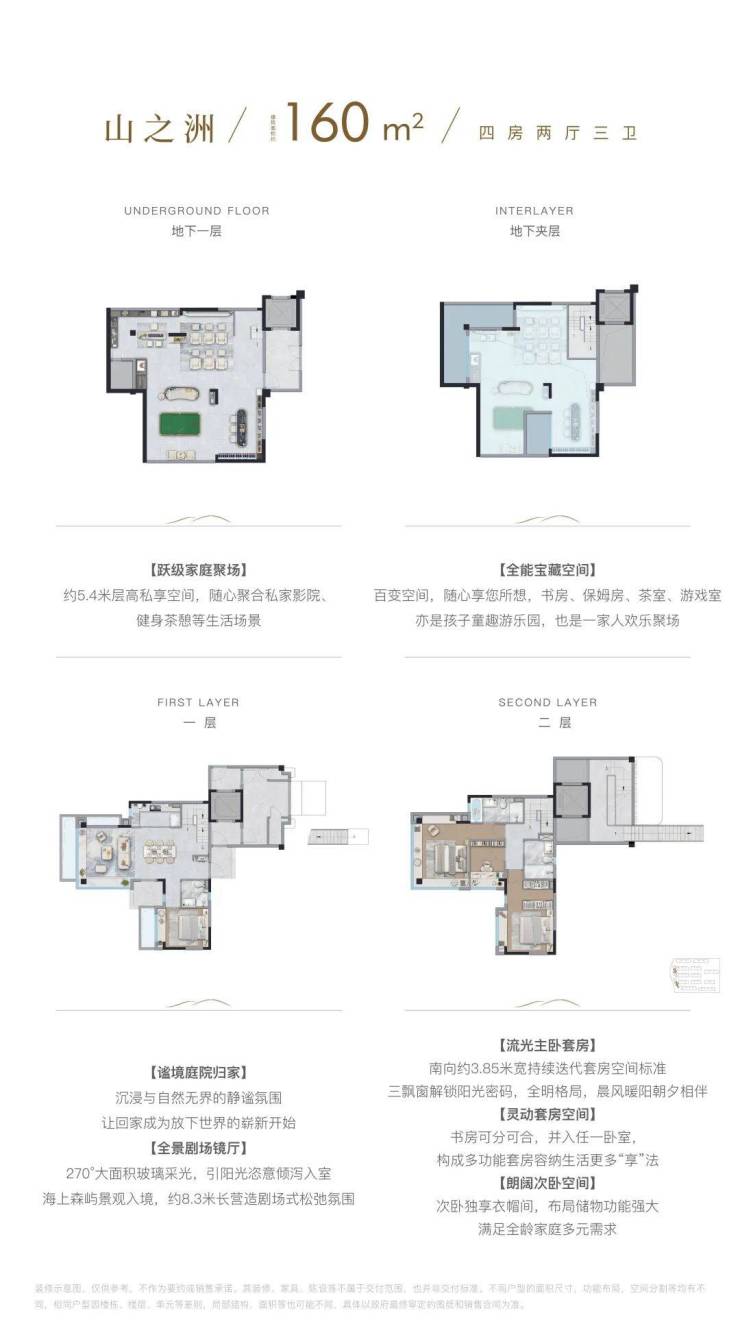 地下一层及夹层空间,可以根据业主需求,打造影音室、健身房、酒窖、棋牌室等各种欢娱空间,为美好生活添加无限可能。