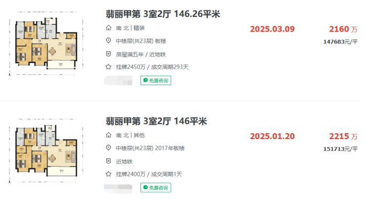 杨浦滨江的标杆项目翡丽甲第就在地块西侧400米的距离,目前该小区挂牌均价15.28万/㎡,近期2套成交单价在14-15万/㎡左右,价格还是相对坚挺的。