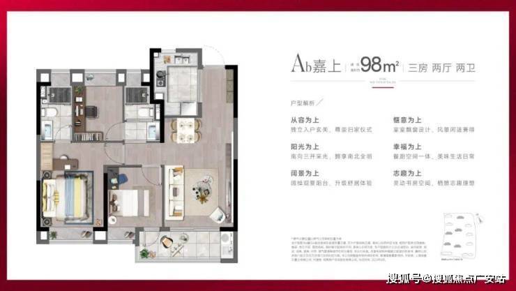 建面约98㎡3房2厅2卫户型,分别是边套、中间套,满足不同人群的居住需求。