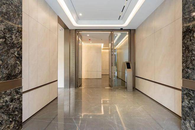 其次,项目还设置了无触入户大堂设计理念的首层单元门厅,业主人脸识别,即电动门自动打开。门厅的墙面两侧屏风为铂金钻石材重点装饰,顶面为曲面悬浮吊顶,给业主高端住宅般的归家体验。