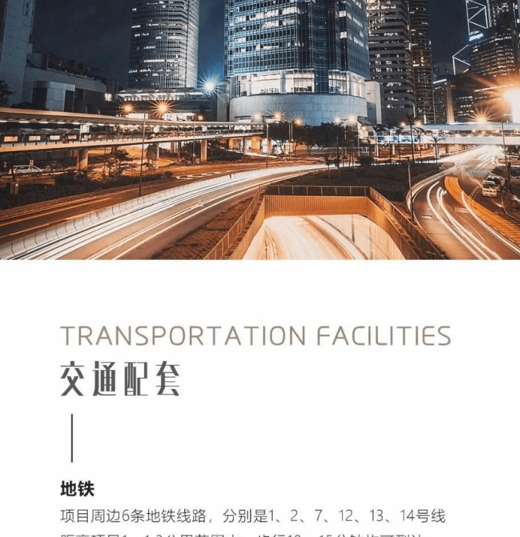 交通配套:周边6条地铁线环绕 1/2/7/12/13/14号线 (1公里左右)