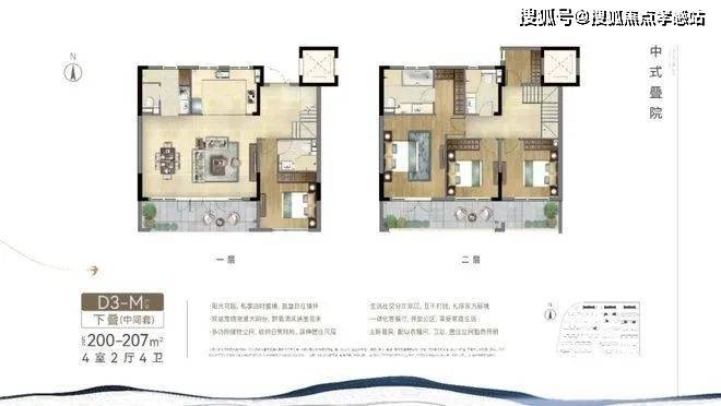项目中叠户型方正,三开间朝南,最大限度的采光,同时功能齐全,居住舒适。这个户型从街巷的北侧入户,与下叠的南侧入户形成分流,很好地提高了私密性,大门入户是中式的门头,尽显中式韵味。