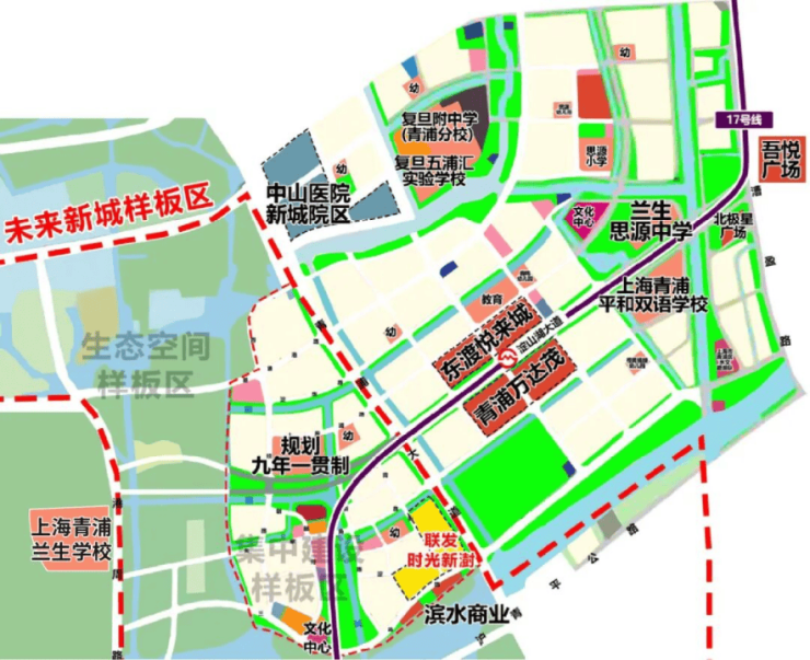 周边坐落商业建面约43万㎡的青浦万达茂、东渡悦来城两大站前超级商业,再往东还有吾悦广场等。未来,样板区南侧还有联发集团打造的两幅滨水商业。