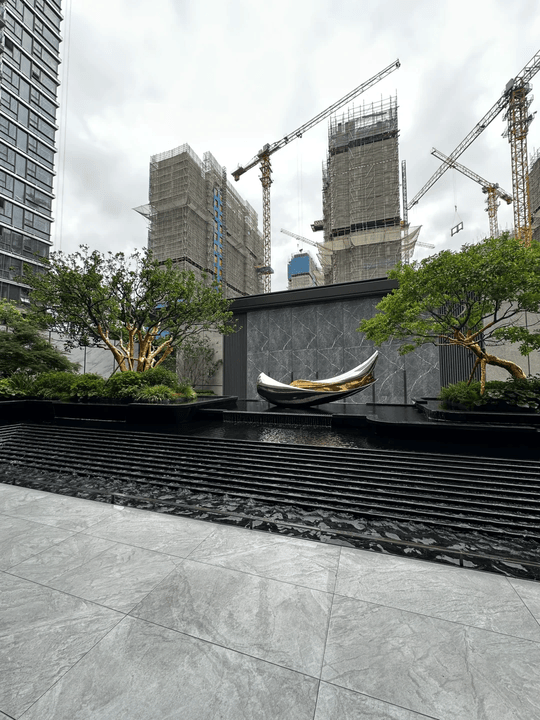 项目以现代艺术美学为设计理念,外立面采用香槟金铝板+玻璃幕墙,搭配光感幕墙与立体边框,呈现高端质感。社区内部规划“双轴、一环、一会所、三进、多花园”景观体系,配备约2000㎡下沉式会所,含恒温泳池、健身房、瑜伽室等高端设施,满足全龄段休闲需求。