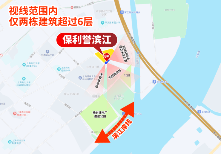 恰到好处的建筑高度,搭配正面无遮挡的瞰江角度,将江景视野做到更大化与更优化:向南望去,黄浦江的壮阔江面与杨树浦电厂公园、油酷艺术公园等滨江绿带无缝衔接,未来杨树浦电厂更有望成为整个上海滨江的“梦中心”