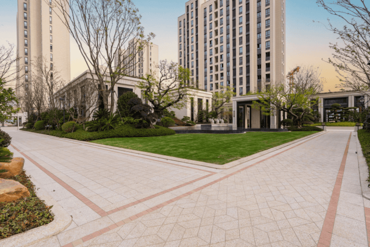第二,水景池采用挪威蓝珍珠打磨,花坛立面-压顶使用保加利亚沉香米黄,搭配堆坡景观,层次错落。