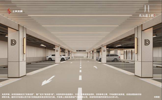 当多数地库还停留在满足基础功能性阶段,吴淞道1號已将车库升维成艺术归家剧场。相比传统车库窄车道与压抑管线外露设计,项目以宽阔车道搭配格栅吊顶,利落线条消解逼仄感,行车视野更开阔,会车更轻松从容。
