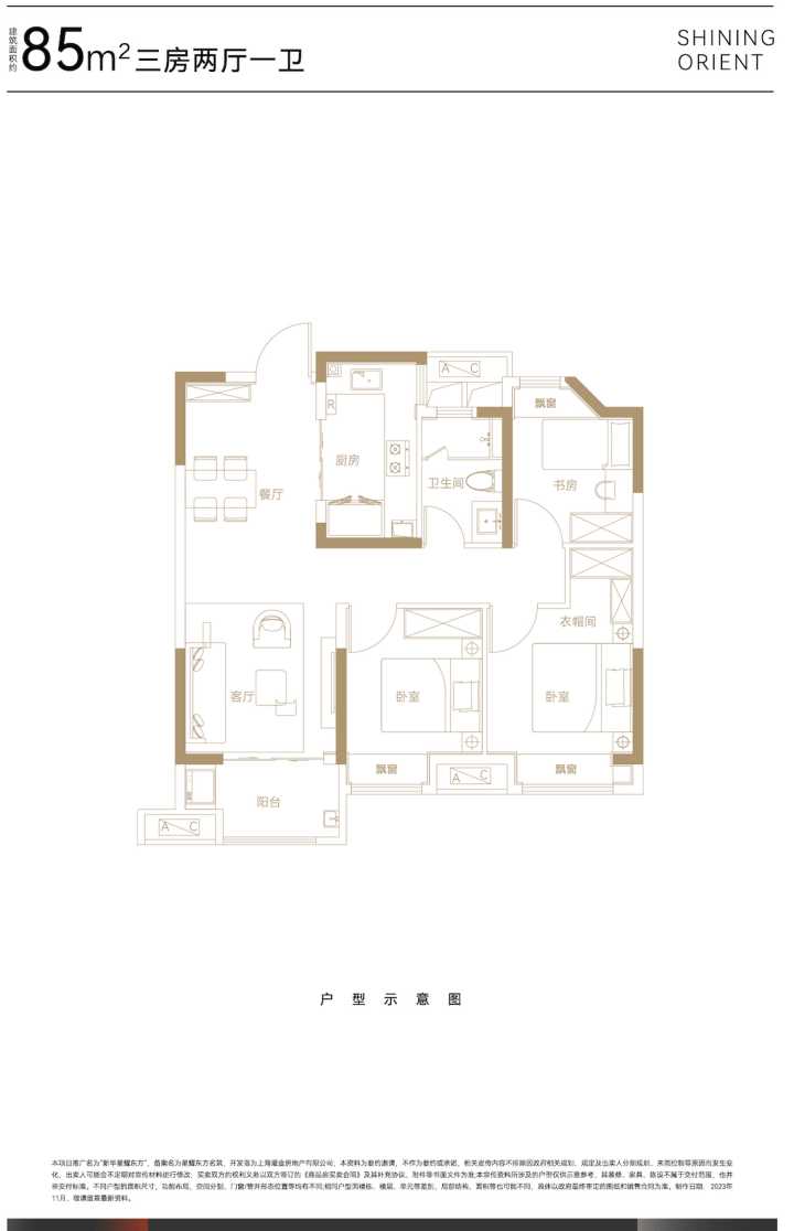建面约85㎡三房两厅一卫