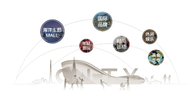 整个购物中心以“潮流、时尚、年轻”为理念,集一线高端品牌,涵盖了社交娱乐、亲子休闲、购物餐饮等主题消费。