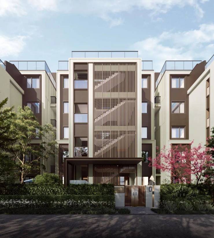 建筑采用现代美学立面,简约潮流,彰显城市精英的风范。窗棱格构的设计别具一格,打破了室内外界限的同时,带来充裕的采光和更好的景观视野。