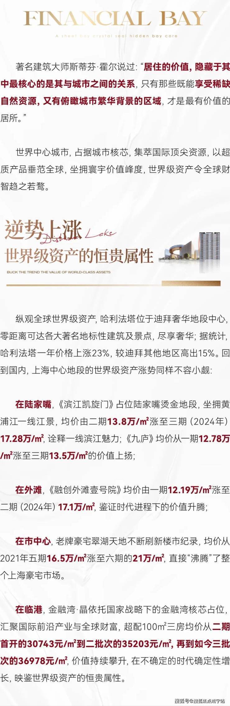【核心价值】临港金融湾·晶作为新片区“封面之作”,地处滴水湖金融湾核心,坐拥“一环二园三水四景”景观体系与270°L型观湖阳台,重新定义高端湖居生活1。项目直面滴水湖一线景观,北岛樱花、西岛双子塔尽收眼底,铝板+玻璃幕墙打造“天幕立面”,品质对标十万单价豪宅23。