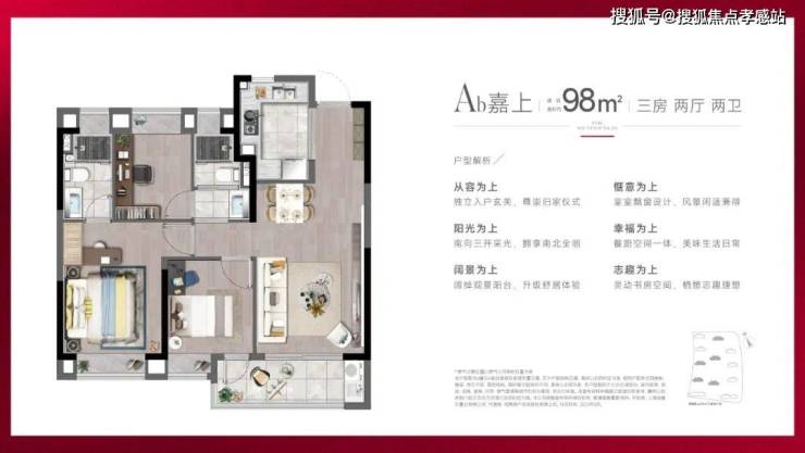 建面约98㎡3房2厅2卫户型,分别是边套、中间套,满足不同人群的居住需求。