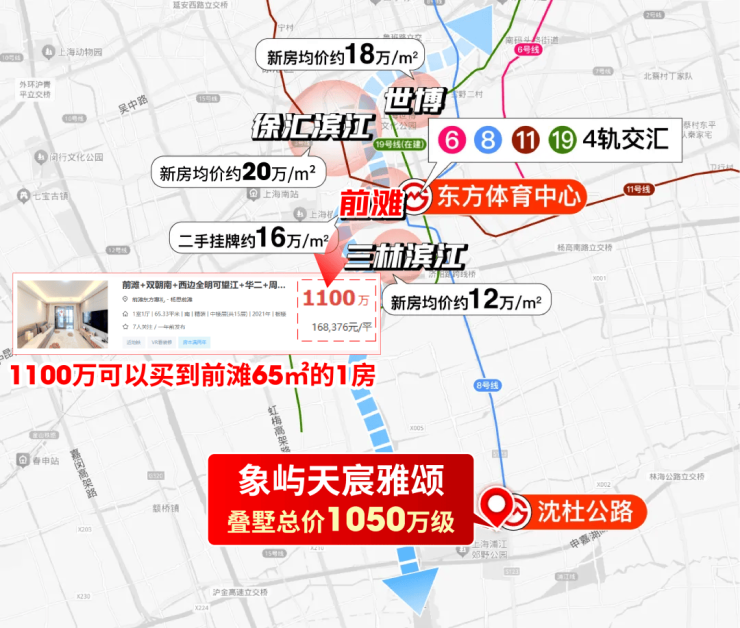 我们来看这条黄金轴的房价,世博新房18万以上,徐滨20万左右,千万预算似乎连门槛都摸不到。