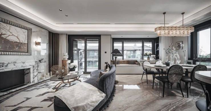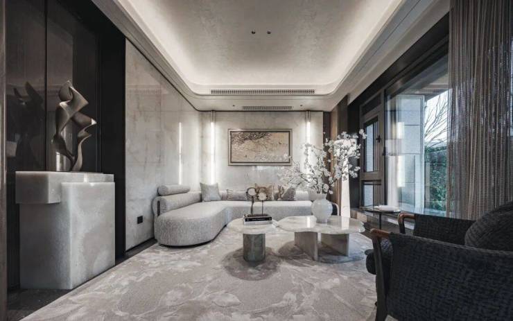 首先是奢石含量极高,从入户处的玲珑玉拼花与透光云石辉映,到翡翠绿奢石墙景、再到 发光云石装饰点亮归家路,石材的典雅贯穿始终。