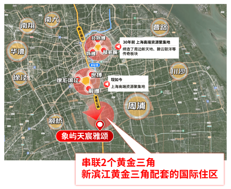 众所周知,项目高端城市资源高度集中在2大滨江黄金三角:由外滩-陆家嘴-北外滩构成的传统中央商务区,由前滩-徐汇滨江-世博构成的新兴中央活动区。其他所有板块几乎都是经由它的价值辐射。换言之,谁距离他们更近通勤更快谁就更有未来!