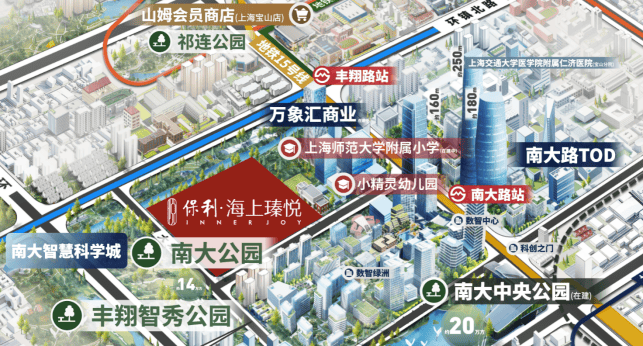 在保利·海上瑧悦的15分钟生活圈内 商业力拉满,除了邻近的 丰翔路和南大路双TOD外,还能够享受到 山姆会员超市、盒马等诸多优质城市配套,赋予了保利·海上瑧悦极高的生活便利性。