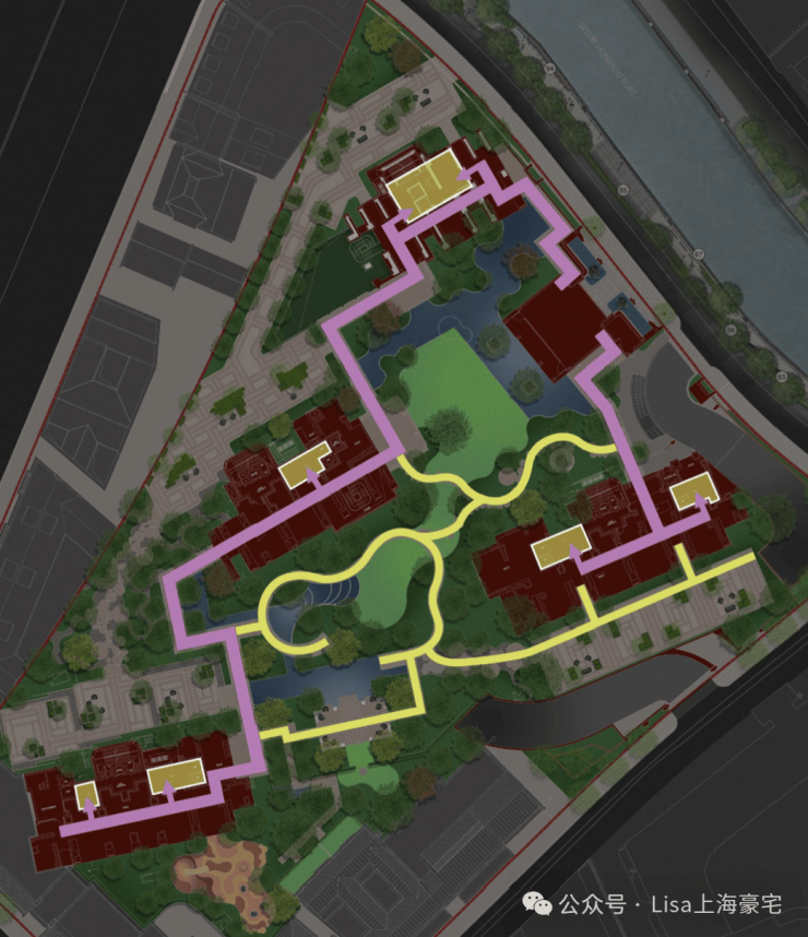 社区约3000㎡的中心花园和6大艺术花园,不仅让每栋楼都享受“楼王”的待遇,且自然勾勒出一条漫游式的公园归家动线(黄色线条走向)