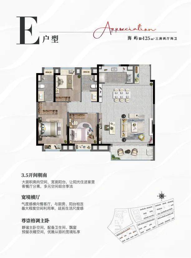 户型解析: 三开间朝南,全明通透宽域,全天候优质采光;空间一体化设计,消除客餐厨阳台的空间界限,延展多元生活逸趣;揽景飘窗、主卧、次卧皆配飘窗,延拓房间视野,静聆自然韵律。