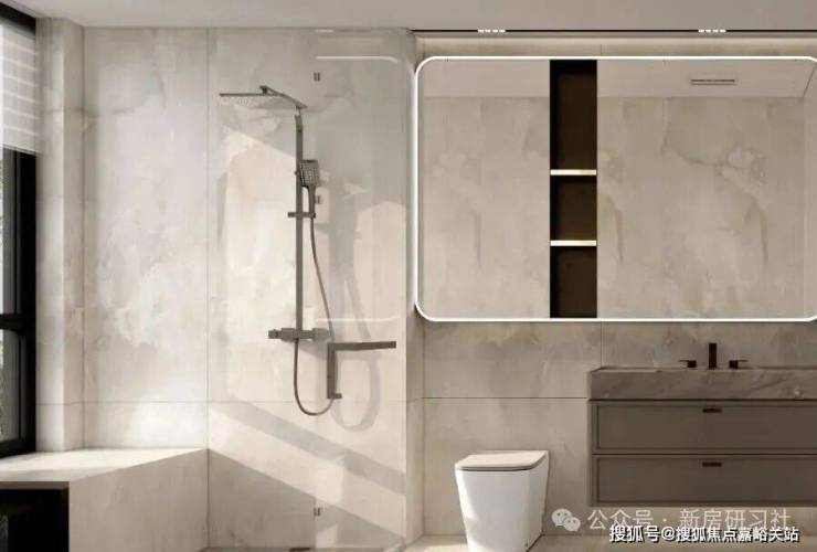 配备美妆龙头,大容量镜柜可收纳洗漱用品,利用墙面空间设置壁龛,便于存放毛巾、衣物便于取用。