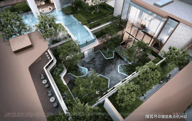 社区内 8 栋楼有 5 栋有架空空间覆盖,共计约 1700㎡,最高建筑层高约7.2米。架空空间以休闲下沉卡座、水吧台、休闲会客区打造,联动室外水池,营造出酒店式度假空间。此外,项目还规划有超 250平 “悬挑水池”,甚至可以在漂浮中冥想疗愈。下沉庭院四周设有不同功能空间,包括健身房、归家大堂、阳光地库光厅等,实现 360 度不同视角的景观体验。风雨连廊系统串联珍稀苗木与洄游动线,实现 “四季有景、步移景异” 的五星级度假体验。