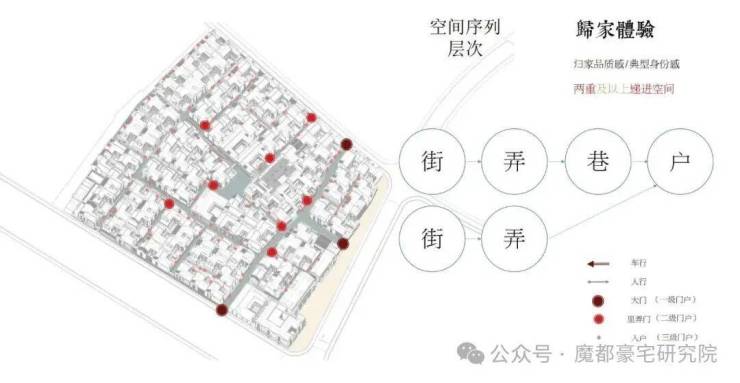 士林润园社区规划可分为蓬莱路城市公共景观以及社区内部景观两个部分,其中市政绿地衔接于上海2035城市总体规划中“蓝绿丝带”的上位条件要求,社区内部街巷空间形成空间序列形成递进的层次,将归家体验的序列依次展开,形成城市街道→入口(一级门户)→街巷→节点空间→里弄门(二级门户)→合院入户(三级门户)的方式,基本可保证大多数住户可体验到两重以上的空间递进。
