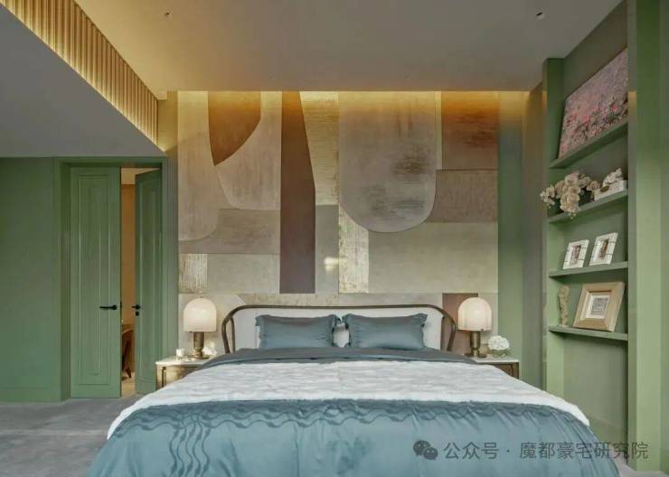 顶层下午茶区以淡绿为底,壁炉暖光漫过手绘地毯的肌理,将社交场域沉淀为冥想容器;主人房墙面缟玛瑙(Onyx)的天然流痕,也与一层屏风暗纹形成时空对位,光影在矿物晶体中生长出私密的诗。