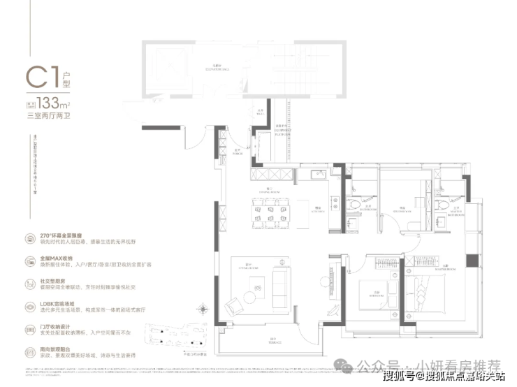 这个户型,入户玄关收纳、双开间的阳台、宽大的U型厨房,和套房主卧带步入式衣帽间+全景式飘窗,是比较突出的亮点;