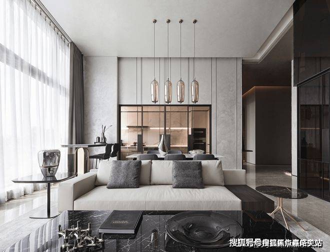 客厅后侧是厨房,格挡是采用深色玻璃制作而成的推拉门,内部整体为白色柜面,墙体呼应客厅背景墙,以爵士白大理石为装饰,优雅温厚,细节充盈。