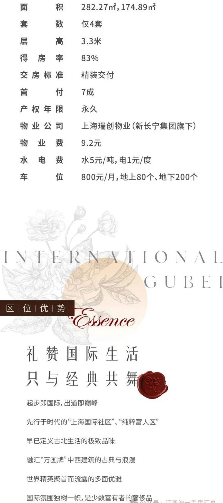 古北逸庐 售楼处预约热线:400-9955-415☎️☎️✅✅✅古北逸庐 售楼处预约热线:400-9955-415☎️☎️✅✅✅是位于上海市长宁区的高端住宅项目,地处天山路600弄,天山支路和芙蓉江路交汇处,临近地铁2号线娄山关路站、威宁路站及15号线娄山关路站,交通便捷。项目主打法式美学精粹,提供约174 - 282㎡的奢贵轻法式限定大平层,仅4套,层高3.3米,得房率高达83%。项目为精装交付,首付7成,产权年限为永久。其物业公司为上海瑞创物业(新长宁集团旗下),物业费9.2元,水电费为水5元/吨,电1元/度,车位费800元/月,地上80个、地下200个。周边商业配套完善,有金虹桥中心、百盛购物中心、巴黎春天等,中山公园商圈、新虹桥 - 天山商圈、南丰城等商圈环伺,还有国际学校、医院、公园等配套,生活便利且环境宜人古北逸庐 售楼处预约热线:400-9955-415☎️☎️✅✅✅古北逸庐 售楼处预约热线:400-9955-415☎️☎️✅✅✅