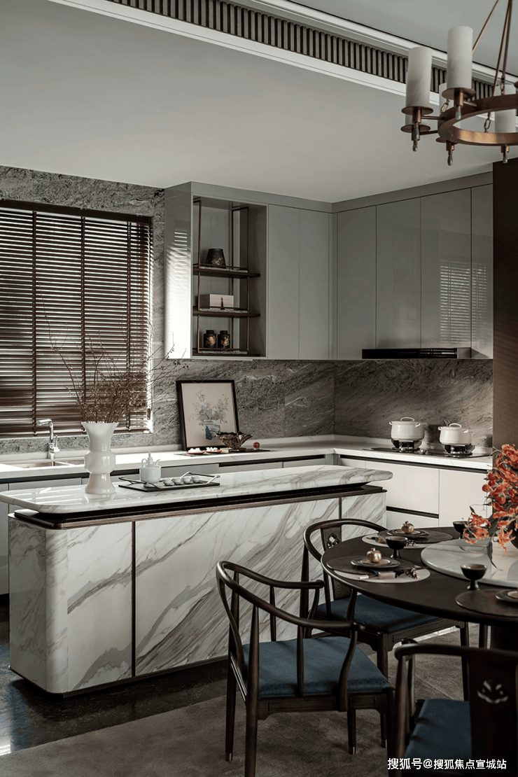 采用环形布局的厨房,专门在中间位置设立大理石岛台,转而让该烹饪区域有了一种奢侈高端感。叁主卧