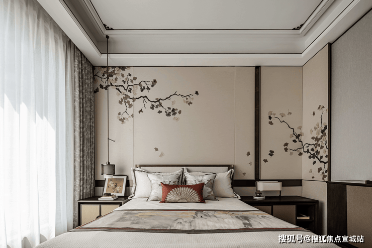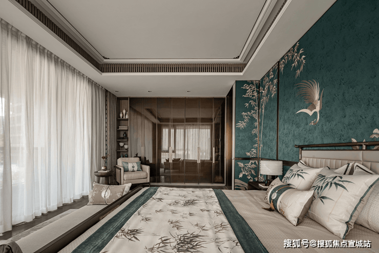 主卧间的主题墙属于空间中最亮眼的艺术品,由金丝刺绣制造的凤凰飞翔于青竹林间,呈现出一幅传统古韵的画面。肆次卧
