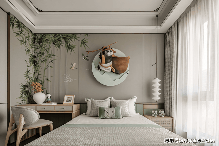 儿童房的设计则是风趣十足,背景墙上布满了竹林的装饰印花,中央悬空的功夫熊猫为空间内增添了不少活力。