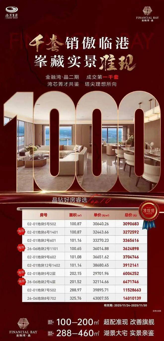 金融湾·晶售楼处电话:400-8855-420✨【官方认证】✅✅✅位于上海临港新片区滴水湖金融湾核心区,是临港唯一一线环湖住宅项目。项目由陆家嘴集团开发,总建筑面积约38.4万平方米,容积率4.0,绿化率30%,规划16栋24-32层高层住宅,共1860户。项目主打100-463㎡大平层,户型设计注重空间尺度与观景体验,部分户型实现三面采光、双主卧套房,实得率高。社区打造“一核两带四组团”景观体系,含2000㎡中央水景核、金融艺术雕塑、智慧健身区等,配备5000㎡云端会所,含天际泳池、金融沙龙空间。项目自带1.2万㎡“金融湾坊”商业街,周边3公里内辐射临港万达商圈,15分钟消费圈成型。交通便捷,距地铁16号线滴水湖站约1.5公里,距在建两港快线开放区站约1.1公里,未来15分钟直达浦东机场。项目定位为临港金融核芯的湖居典范,兼具自住与资产配置价值,是追求高品质生活的购房者的理想选择