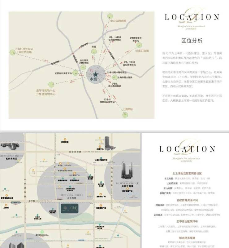 一、区位和交通:1.1、我们地处闵行长宁交界的古北板块,项目依托虹桥交通枢纽和长宁徐汇商圈,交通便利配套成熟,是上海第一个大型高标准的国际豪宅社区。
