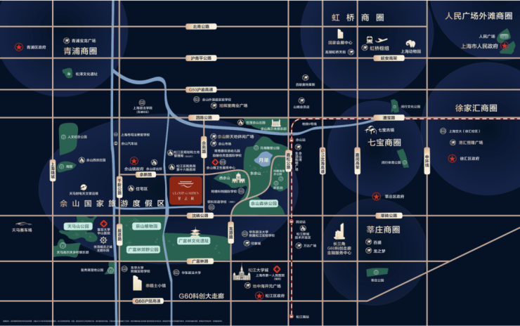 而这份静谧从非隔绝繁华。项目紧邻地铁9号线佘山站,15分钟步行可达,6站换乘2号线直抵虹桥商务区,15站畅达人民广场;沪昆高速、沪渝高速等主干道环绕,25分钟覆盖虹桥枢纽,35分钟直达陆家嘴、静安寺等核心商圈。生态与交通的双重优势叠加,让“依山而居,通勤无忧”成为现实。
