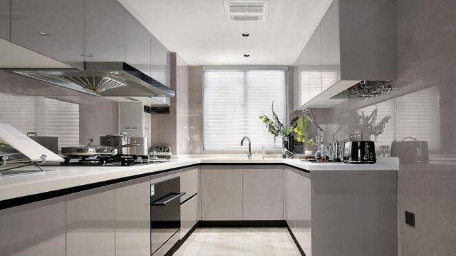 厨房空间,采用铝合金玻璃PVC饰面免漆门套及铝合金移门✅✅大家映翠府售楼处电话:400-8787-740✅✅三件套使用老板的油烟机、燃气灶、洗碗机交付,更有摩恩的水槽和龙头、定制的组合橱柜。