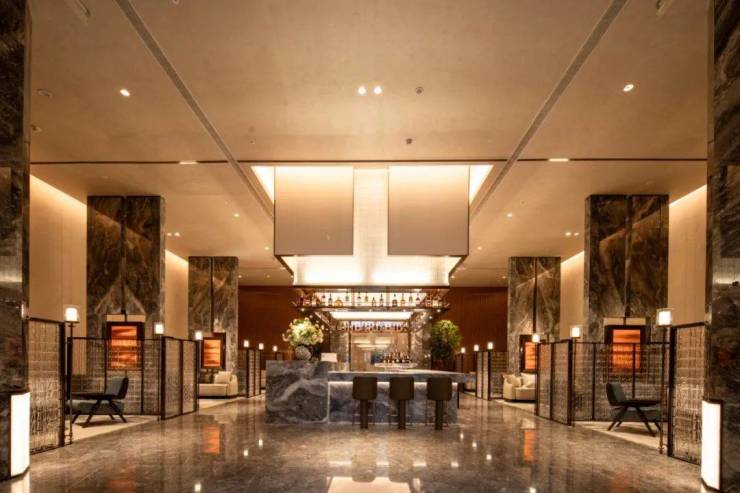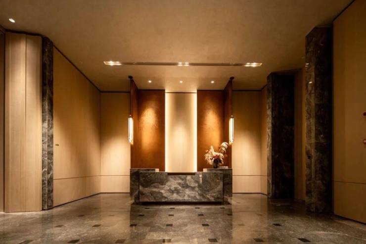 除了立面,项目在公共空间和室内空间同样大量采用奢石,高贵质感几乎遍布室内外。