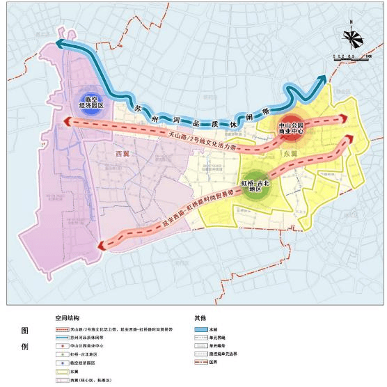 天山路/2 号线文化活力带:串联中山公园、上海国际体操中心、虹桥文化艺术中心等文化节点和轨道交通 2 号线沿线 TOD 社区,打造商业、商务、文化融合的都市发展带。
